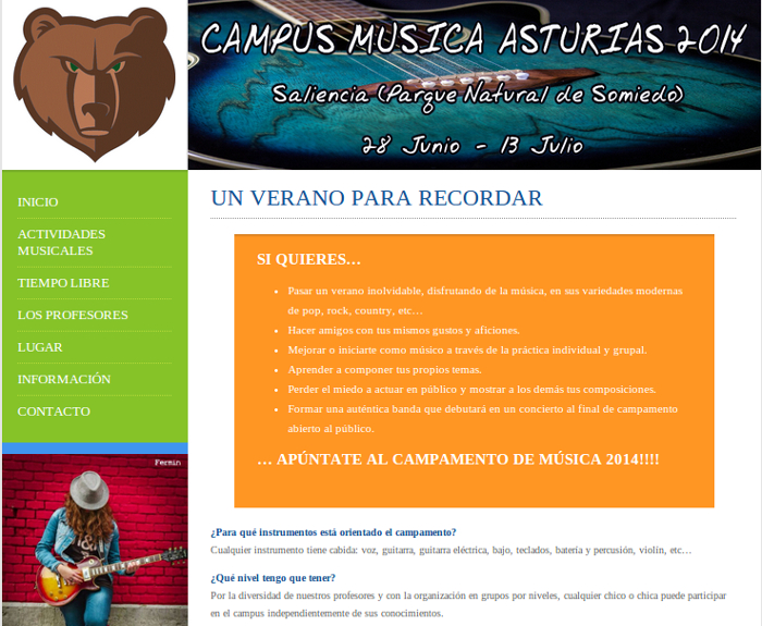 Campamento Mísica Asturias 2014 Web para un campamento juvenil de temática musical en Saliencia (Parque Natural de Somiedo), Asturias (España) Tecnologías HTML, CSS, PHP