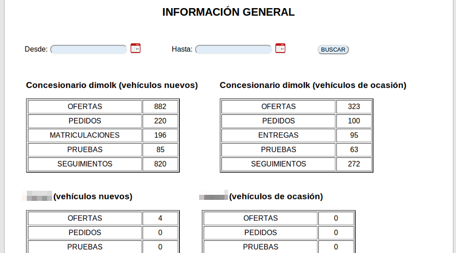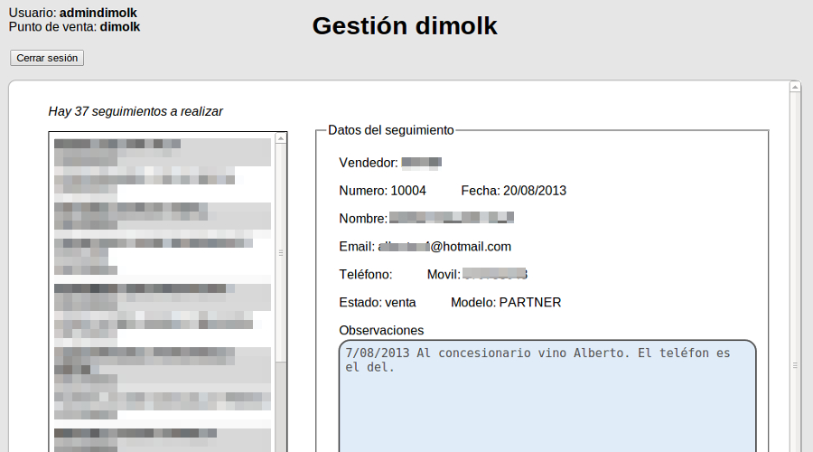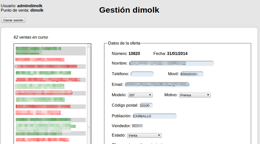 Gestión interna de un concesionario automovilístico de Galicia (España). La aplicación se usa para la gestión interna de:- · Vendedores (usuarios del sistema)