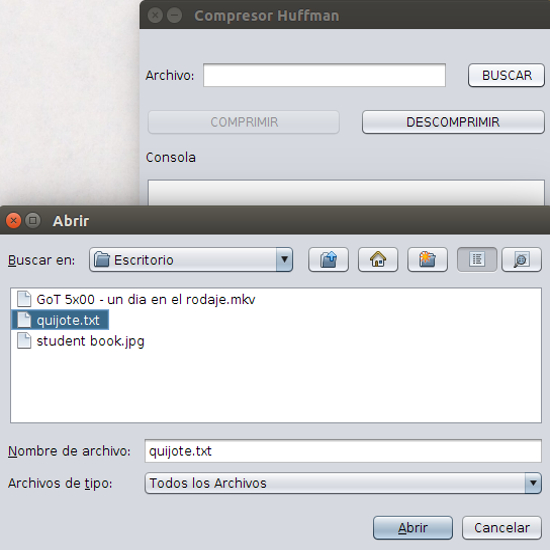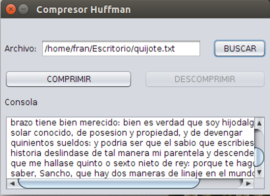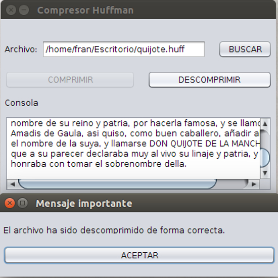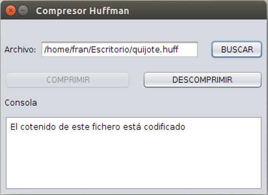 Aplicación de escritorio desarrollada en Java que, mediante el algoritmo de Huffman, se encarga de realizar compresiones sobre archivos en texto plano, recudiendo significativamente su tamaño. Tambien implementa la función de descomprimir ficheros compresos con este algoritmo para recuperar el contenido original.Proyecto personal realizado para afianzar conocimientos sobre árboles binarios.