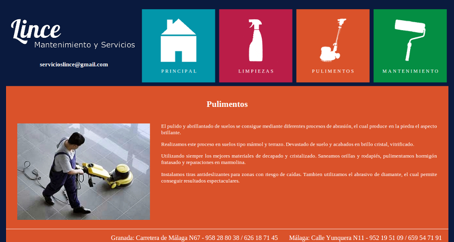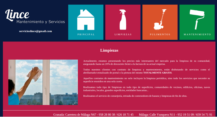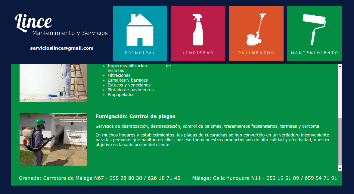 Servicios Lince Web de una pequeña empresa dedicada al mantenimiento y servicios para comunidades en Málaga y Granada (España). Url www.servicioslince.es Tecnologías HTML, CSS
