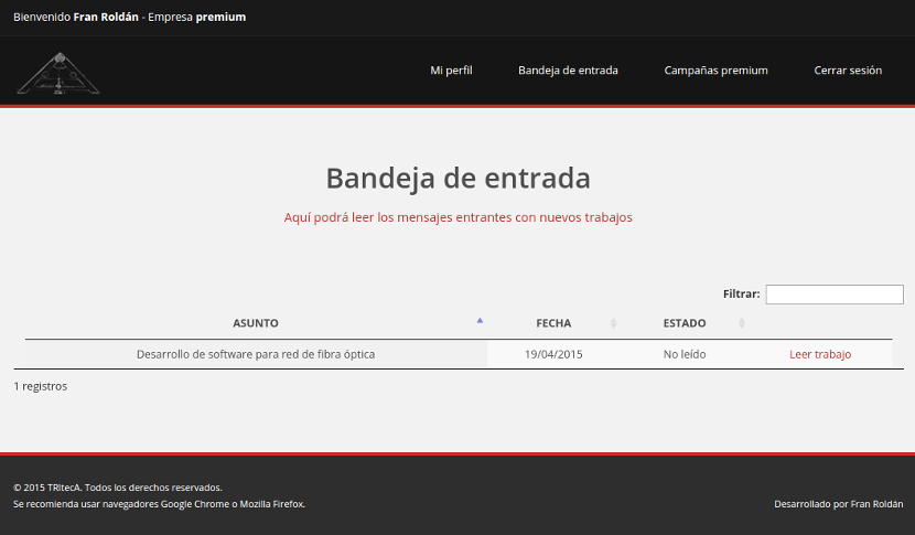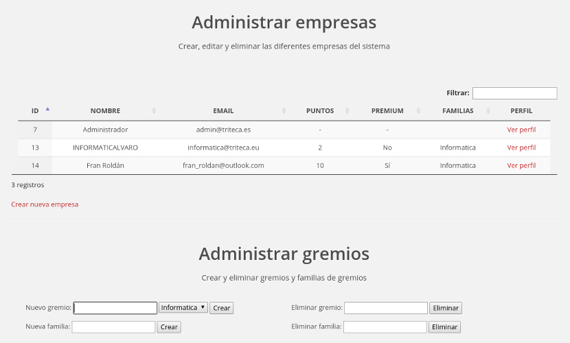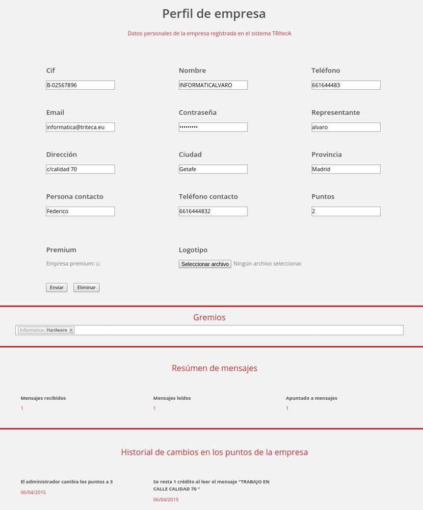 Aplicación para la gestión de empresas de construcción, gremios de trabajadores, publicación de trabajos y subastas de los mismos entre las empresas participantes. Las empresas disponen de un número de créditos que serán invertidos en acceder a la subasta de trabajos. Las empresas catalogadas como "Premium" no tendrán límite de créditos.| Tecnologías | HTML5, PHP, MySQL, jQuery |